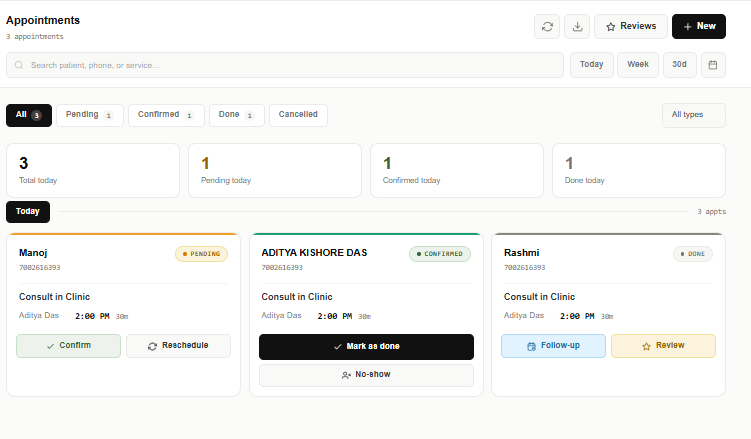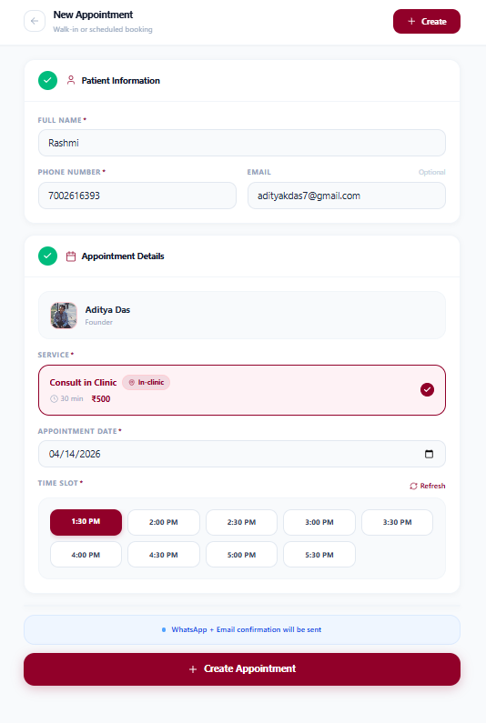 Patient gets a confirmation WhatsApp from your wallet. Reschedule is also available from here.