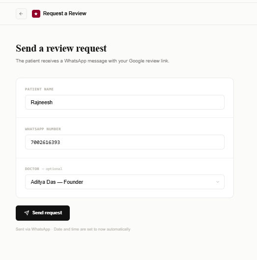 Sends the patient a WhatsApp with your Google review link (deducted from wallet). Use when the visit went well and you want to grow your rating.